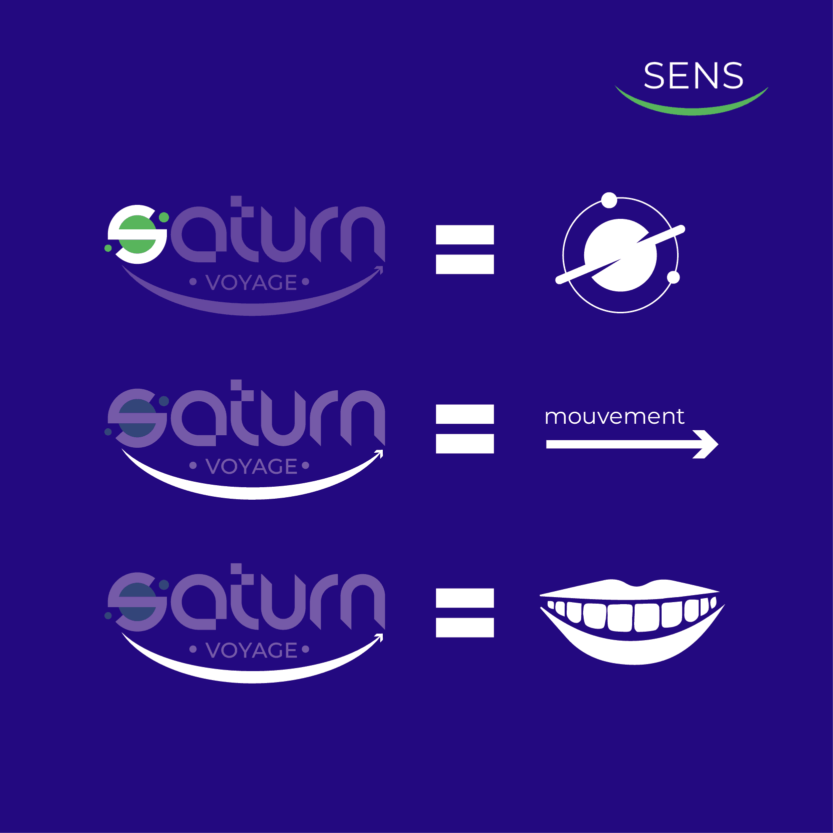 Le mot "Voyage" est au cœur de la création. Il symbolise le mouvement, l'exploration et l'aventure. L'idée de voyage est traduite visuellement à travers la forme de la lettre "S" esquissant la planète Saturne qui évoque la traversée et la découverte. Cela permet de créer un lien émotionnel avec le public, en suscitant des sentiments d’émerveillement et de curiosité.